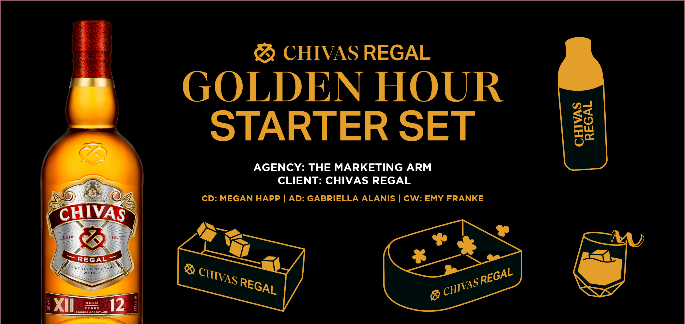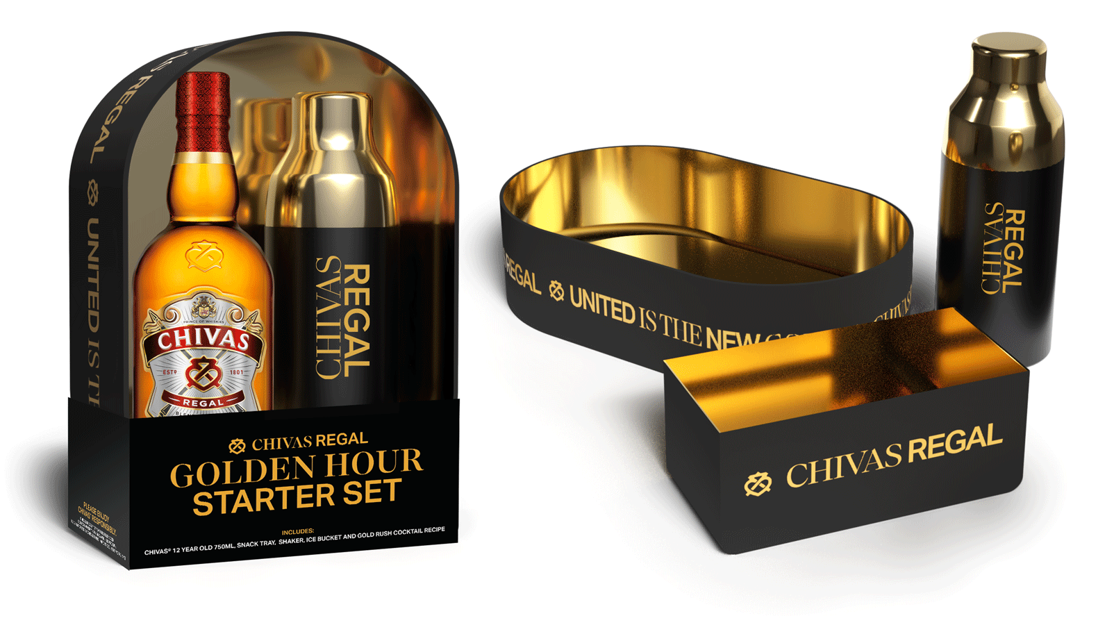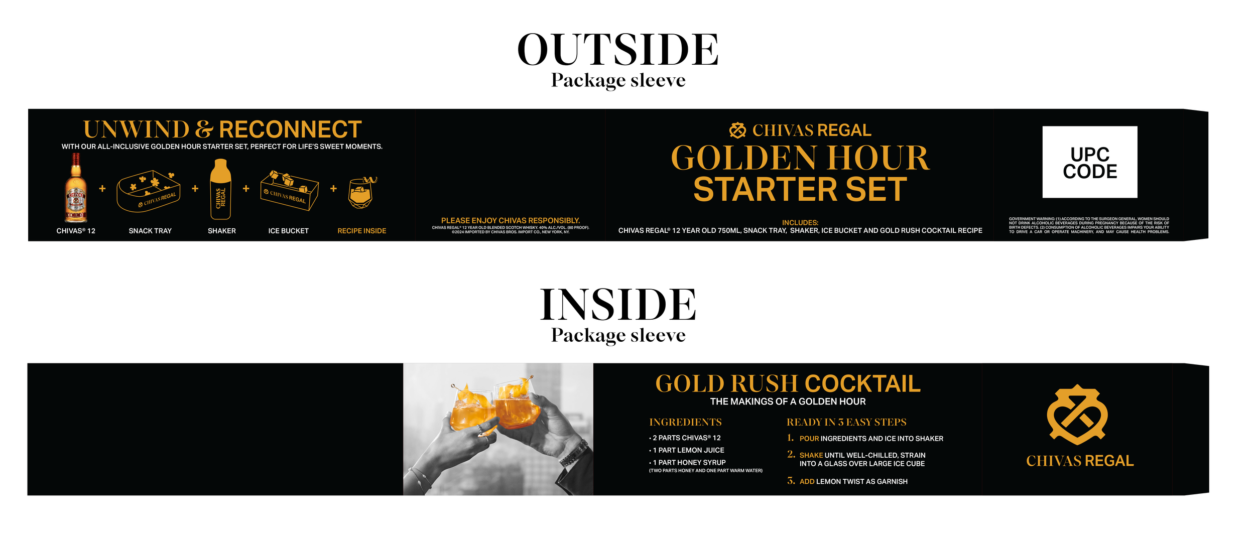 Chivas Regal approached us with the task of creating a custom Value Added Pack (VAP) for a retailer. The challenge was to design an environmentally friendly and sustainable solution, eliminating the use of plastic. Our innovative answer was the Golden Hour Starter Set, a food-grade reusable structure that functions as both an ice bucket and a snack tray. The VAP securely held the product and a cocktail shaker using recyclable paper inserts. A packaging sleeve provided instructions for use along with the Gold Rush cocktail recipe. Although the retailer partnership fell through, the brand team loved the VAP so much that it is now used as an always-on buy piece nationwide.