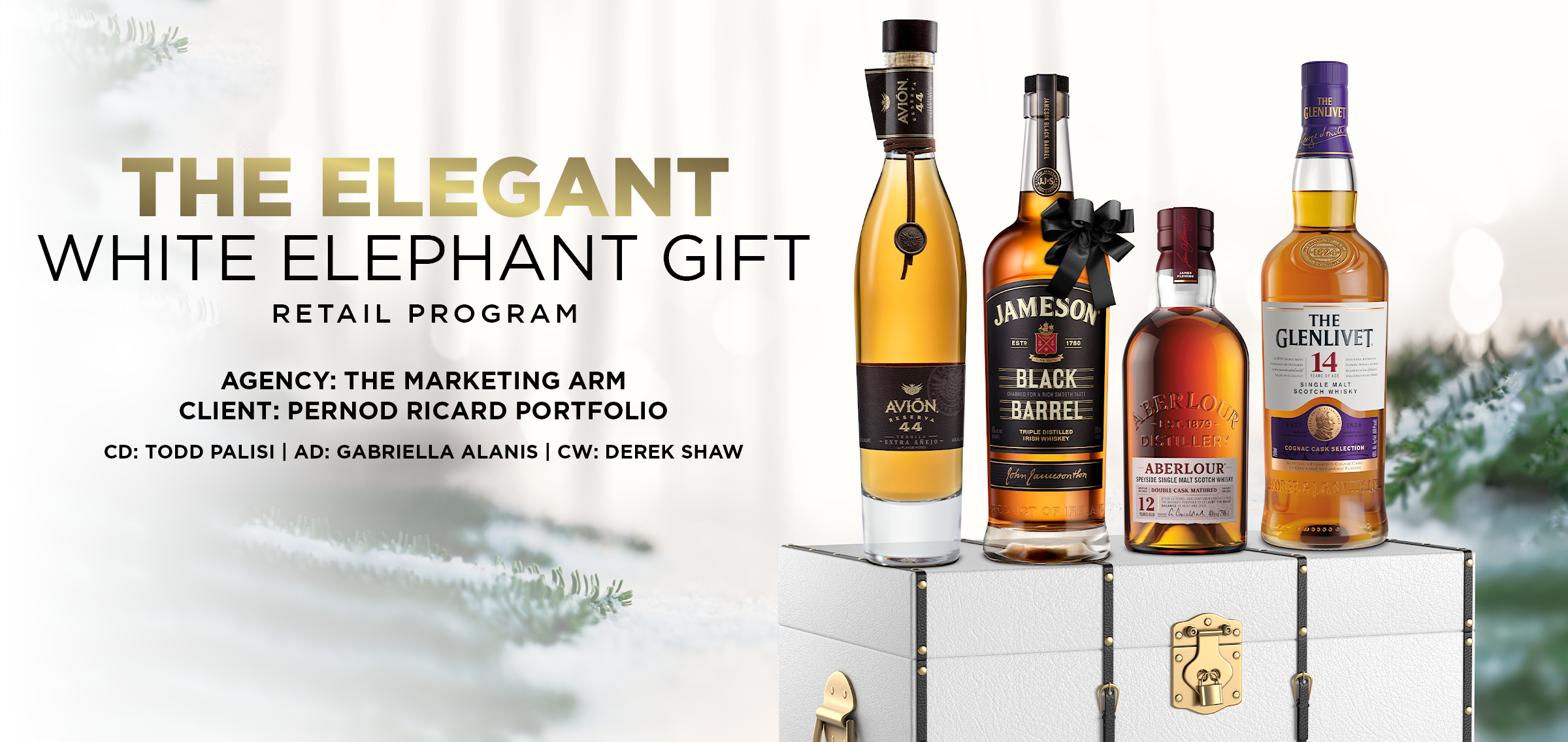 Pernod Ricard wanted to take holiday soirées to the next level by showcasing its portfolio of top-shelf spirits. Our answer was an elevated take on a beloved tradition: an elegant white elephant gift exchange. We partnered with Reserve Bar to offer the perfect solution for mass-appeal gifts with a playful twist. I created a preliminary design for the season’s most steal-worthy gift: a bespoke Cocktail Trunk crafted by renowned South African artist Johnathan Shultz, complemented by in-store elements and custom retail display solutions.